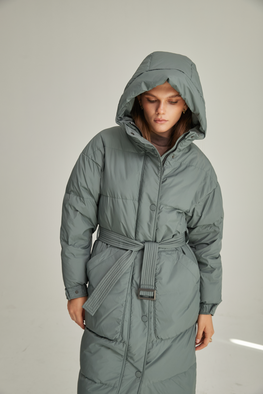Жіночий довгий пуховик зеленого кольору з натуральним наповнювачем